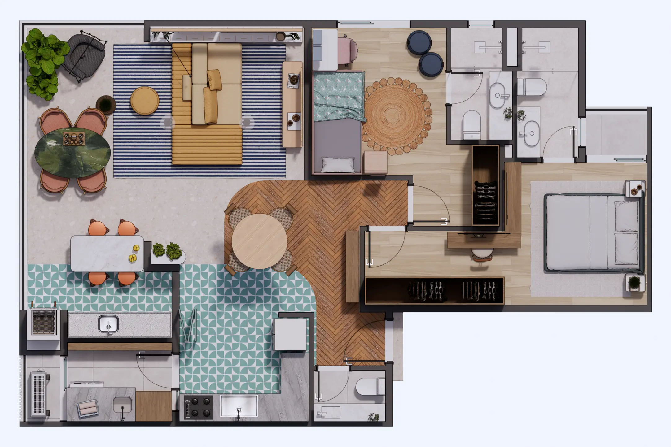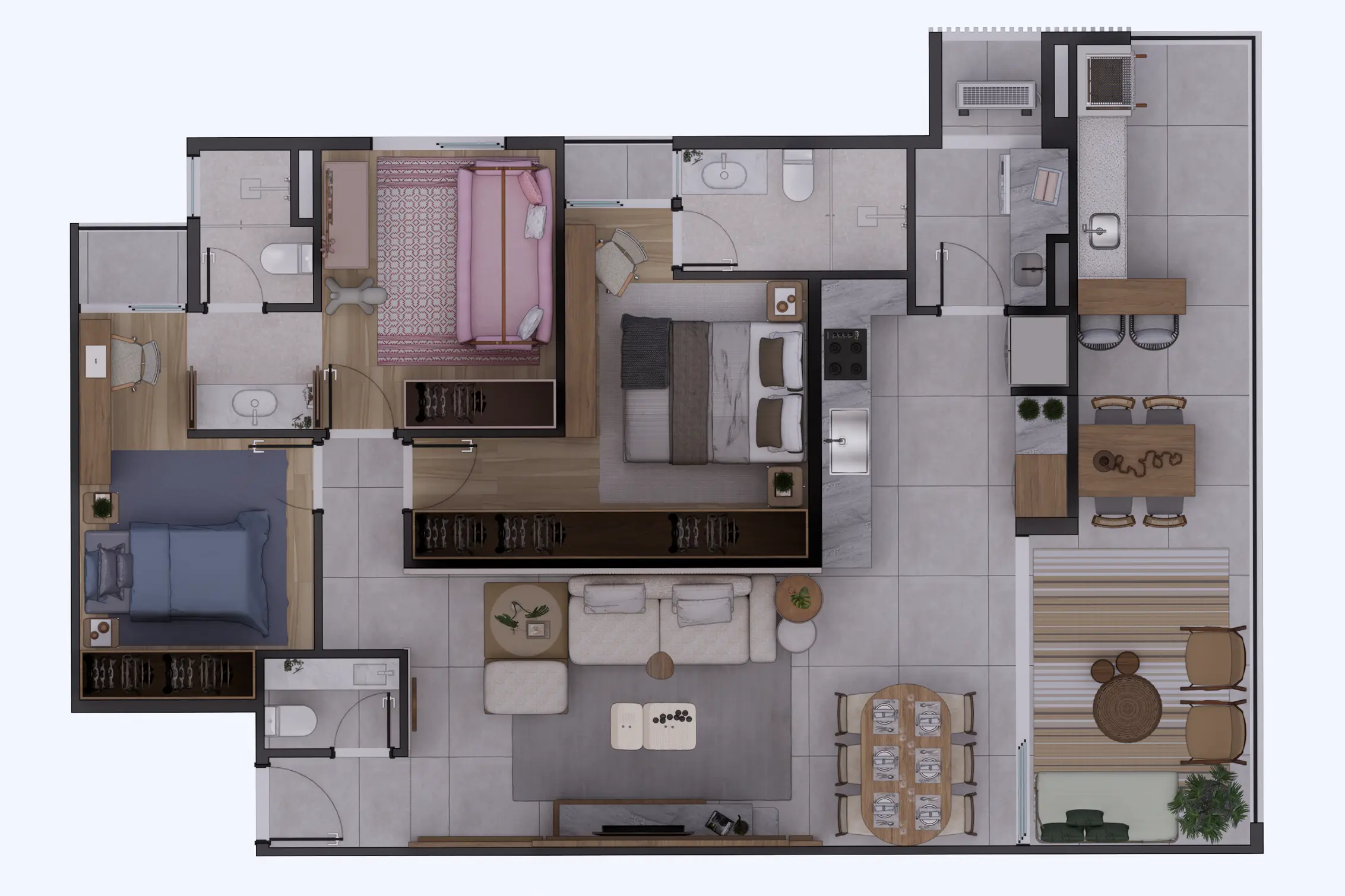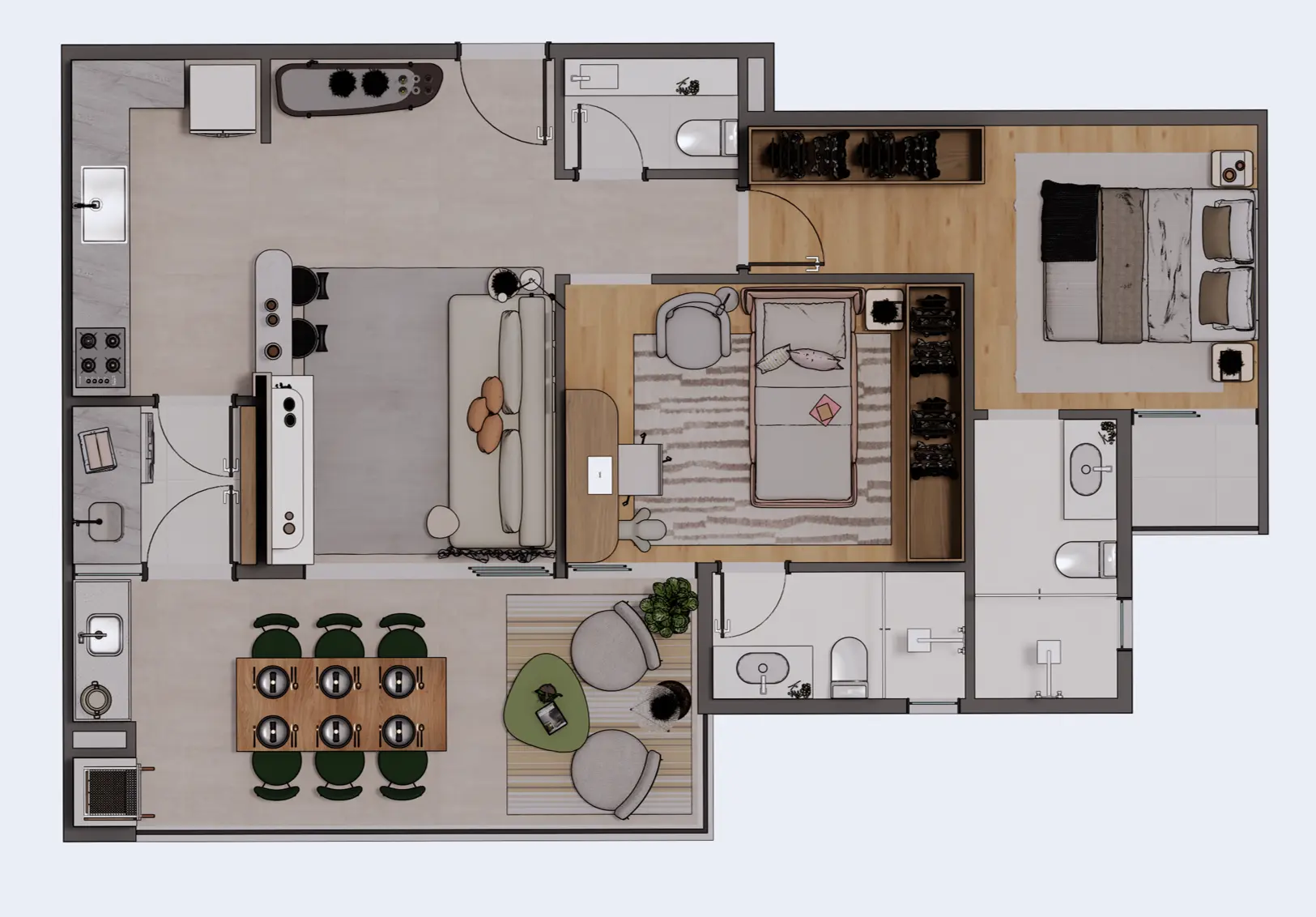 O RAÍZES oferece apartamentos em diferentes tipologias, com metragens de 75 m², 85 m² e 105 m², todos com plantas bem distribuídas e projetadas para atender às mais diversas necessidades. As unidades contam com dormitórios amplos e aconchegantes, além de vagas de garagem confortáveis para dois ou três veículos por apartamento. O condomínio possui infraestrutura completa, reunindo recepção, sports bar, salão de festas, brinquedoteca, pet care, academia, salas de massagem, sauna e coworking, além de áreas verdes e espaços de convivência que garantem lazer e integração. Localizado em uma região estratégica, o RAÍZES oferece fácil acesso a comércios, escolas e serviços, combinando praticidade e segurança em um ambiente privativo e acolhedor. É um investimento sólido, com excelente potencial de valorização, ideal para famílias que buscam um espaço planejado para conforto, estilo de vida e qualidade incomparável.